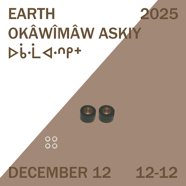 "EARTH (Okâwîmâw Askiy - ᐅᑳᐧᒫᐊᐧᐢᑭᕀ)” is the sixth in a series of twelve annual events taking place on December 12 from 12 noon to 12 midnight. Each year the event moves through each word of the 12-word phrase, You And I Are Water Earth Fire Air Of Life And Death, to activate the word of the year in myriad ways.
