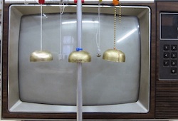 The Electrostatic Bell Choir consists of small bells and pith balls suspended in front of cathode-ray tube televisions. The TVs are muted and tuned to various channels of white noise. A control circuit cycles them on and off in alternating sequences, building up static charges that attract the pith balls and cause them to waver and lightly strike the bells; resulting in quasi-melodic bell compositions. The movement of these apparatuses is subtle and the sound is delicate.