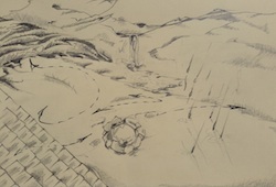 Whispering Rain is an audio installation that displays a sonic, geographic dream. Three different terrains are represented by three separate field recordings, each played through a directional speaker. These are carefully placed in close enough proximity to each other (on the ceiling) for spectators to experience each terrain only a footstep or two from each other. This installation is presented in a darkened room with only a small and brightly lit, hand drawn map to represent this otherworldly topography.