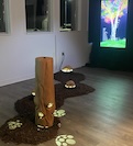 This work explores ways to slow down human engagement, and also makes visible the daily experience of a tree. Inspired by tree rings as evidence of yearly growth, the visualization uses the same logic to image the last 24hrs of the tree’s life, where the outer ring shows contemporary values and each subsequent smaller ring the values from the previous hour. The interface for the visualization is a one-meter-tall cork cylinder that is also a scent sculpture that releases the scent of geosmin (the smell of a forest after it rains) every time it rains in real-time. To interact with the visualization, the participant can hold their hand 3” above the interface and slowly move it forward, enabling them to explore the 3D space. Additionally, there is a point cloud visualization of the tree that was sensed during the summer of 2022. This visualization was created from a LIDAR scan done by the Modelling and Spatial Analysis Lab at the University of Waterloo using a very large drone. This point cloud representation also contains the sensors on its trunk and is affected in real time by the recorded data. To tie all of the elements together, earth has been imported into the gallery – holding the original sensor pods as well as the cylindrical interface. In its entirety this installation creates an embodied and exploratory space where the deep time of a tree’s life is remembered, and the human body is slowed down in the engagement.