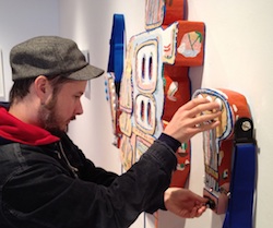James Kirkpatrick from London, Ontario is a dynamic multi-media artist. He is known for his participation in the early Canadian graffiti movement and as the avant-garde hip-hop artist Thesis Sahib. He is also active in a variety of media including drawing, painting, sculpture, zines, mask-making and experimental sound improvisation. His artwork has been shown extensively throughout the US and Canada including shows in New York, Boston, Los Angeles, San Francisco, Miami, Halifax, Toronto and Vancouver. In recent years, his work has incorporated sculptural, kinetic and auditory elements. By combining his 2D aesthetic with custom-built circuit-bent electronics, Kirkpatrick creates hand-held sculptures that function as both musical instruments and experimental sound machines. The sculptures are extensions of Kirkpatrick’s drawing and painting practice and are also used in his collaborations and live performances.